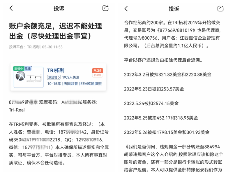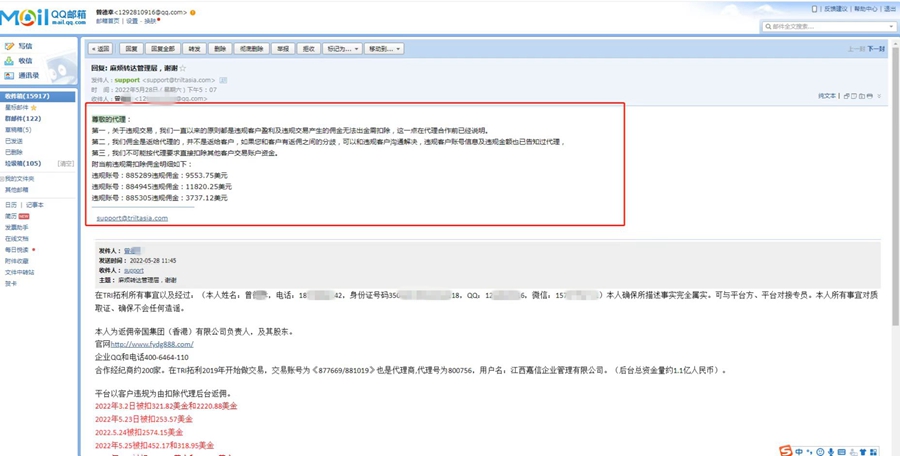 TRI拓利客服是这样答复曾先生的:这批违规客户多次在平台更换身份信息重新注册,并且违规方式相同,(平台)本次会在扣完违规佣金后再处理交易账户。