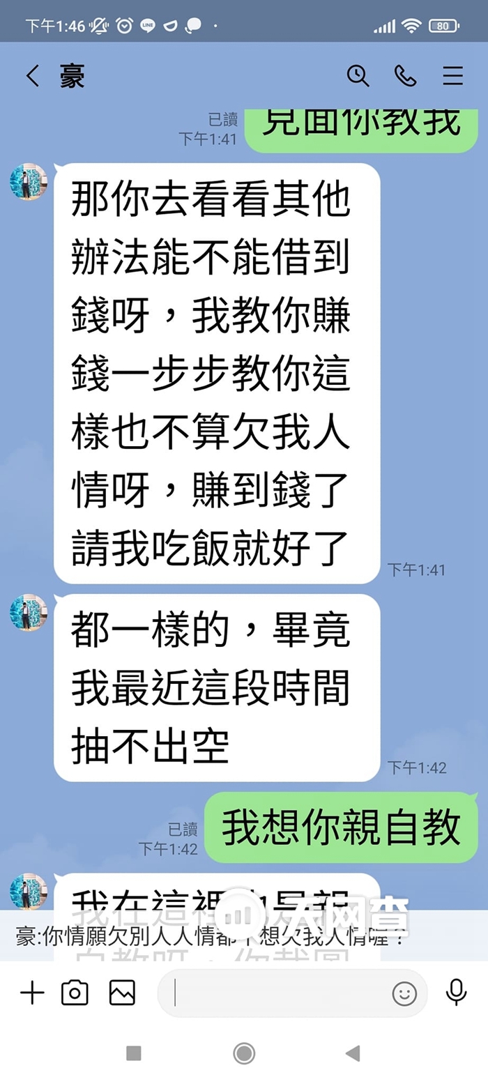 投诉汇友认识了一位昵称为“豪”的网络好友,一来二去的聊天之后,两人就熟悉了。某天,豪称“我教你赚钱,一步步教你……赚到钱了请我吃饭就好了”,怂恿汇友想办法借钱投入到InvestXo平台。