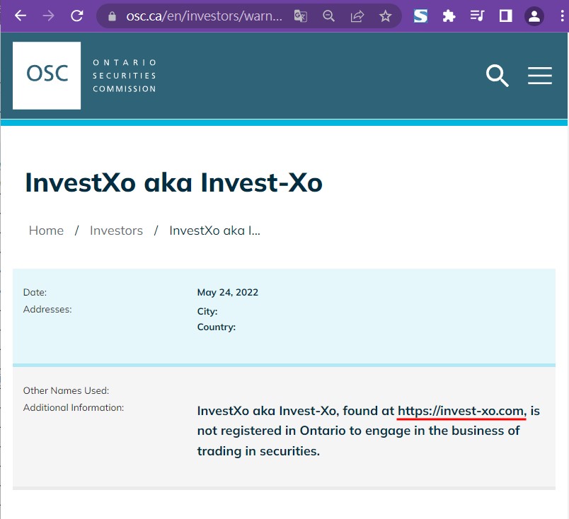 但若要人不知,除非己莫为。我们在网络搜索“InvestXo”,发现该平台已被安大略省OSC列入警示,称平台在安大略省没有注册但却在从事保证金交易业务。