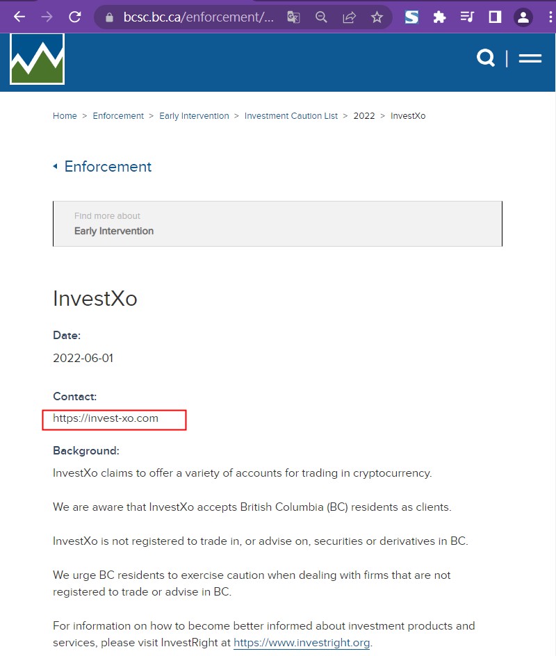 不仅如此,就在6月2日,不列颠哥伦比亚BCSC也提醒投资者警惕“InvestXo”,警示称(如下图):“InvestXo声称提供各种加密货币交易服务,且平台接受不列颠哥伦比亚省(BC)居民作为客户。InvestXo并未在BCSC注册证券/衍生品交易与咨询服务资质。请居民们谨慎与InvestXo打交道。”