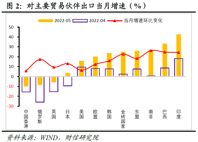 一、低基数、供给恢复和价格上涨,共致出口增速回升较多。5月份出口基数走低,是增速回升的原因之一。分国家看,受益于国内供给能力恢复,对主要贸易伙伴出口增速普遍回升。分产品看,机电产品出口由负转正,对出口形成一定的支撑,但其占国内出口的比重回落较多,显示出疫情对其的制约仍强,国内稳出口压力较大;从量价看,出口价格同比上涨的商品品种更多,且上涨幅度也多数高于数量增速,显示出价格因素对出口支撑较强。