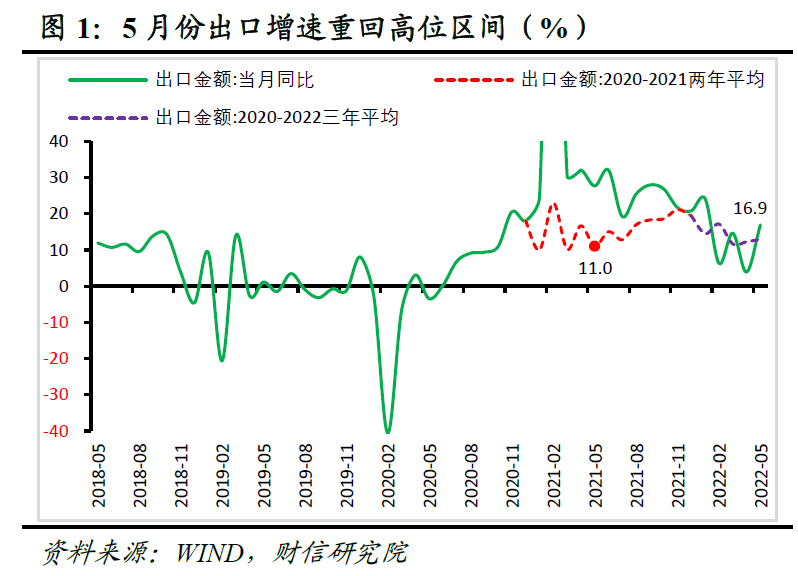 2022年5月份出口金额同比增长16.9%,较上月大幅提高13.0个百分点(见图1)。2021年5月份出口两年平均增速为11.0%,低于前值5.6个百分点,表明前两年5月出口基数走低,是增速回升的原因之一。除基数效应外,本月出口增速回升预计还受到其他因素的影响。