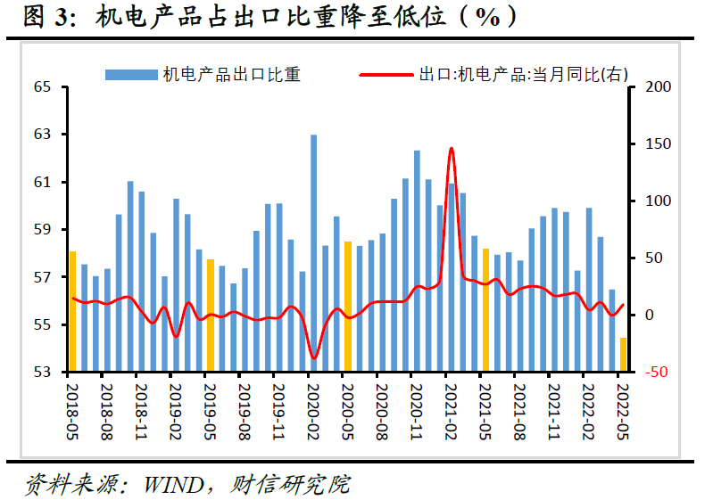 二是分产品看,机电产品对出口增速形成一定的支撑,但疫情对其制约仍强。5月份机电产品出口同比增长9.4%,高于上月9.5个百分点,是出口增速回升的原因之一,但5月份机电产品占总出口的比重较2021年同期下降3.8个百分点至54.4%,远低于2017年以来的同期水平,显示出疫情对机电产品生产运输的冲击尚未消退,国内稳出口仍面临一定的压力(见图3)。