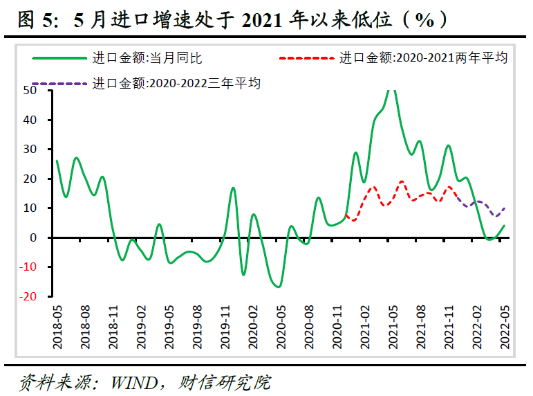 2022年5月份进口金额同比增长4.1%,结束了连续两个月的同比零增长局势,但增速仍处于2021年以来低位(见图5)。