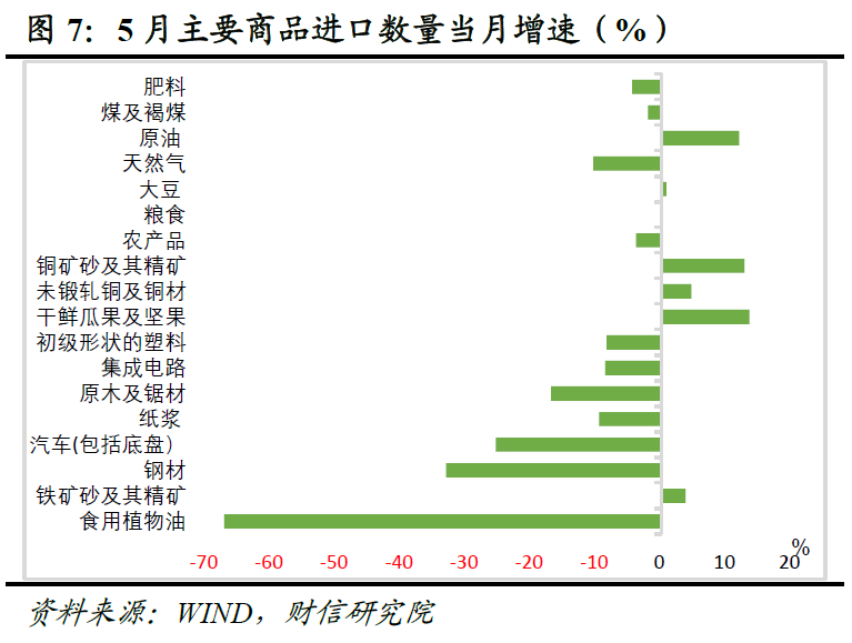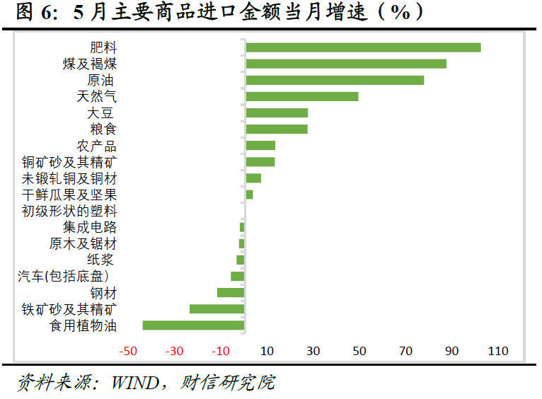 价格是进口增速回升的主要支撑。2022年5月重点监测的18种商品中,肥料、煤及褐煤、原油 、天然气、大豆、粮食、农产品(000061)、铜矿砂及其精矿、未锻轧铜及铜材、干鲜瓜果及坚果等10种商品进口金额同比正增长。从价格看,有16种商品进口价格上涨,且与乌克兰危机相关的肥料、原油、天然气等商品进口价格上涨幅度靠前,显示出国内面临的输入性通胀压力较大;从数量看,仅有7种商品进口数量提升(见图6-8),且数量涨幅明显低于价格涨幅,显示出价格上涨对进口增速的支撑作用更强。
