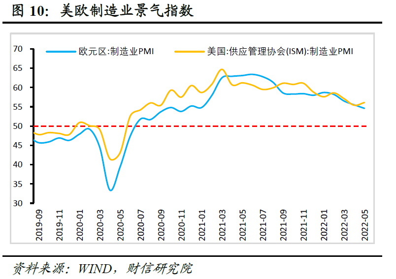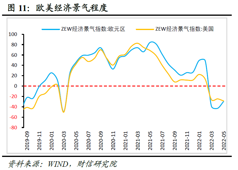 一是受外需减弱影响,未来出口面临回落压力。2022年5月份摩根大通全球综合PMI、全球制造业PMI指数录得51.5%、52.4%,虽较4月份提高0.3和0.2个百分点,但延续2021年下半年以来的回落态势(见图9),显示受地缘冲突持续发酵、全球通胀压力加大、主要发达经济体刺激政策逐步退出等影响,全球经济复苏动能边际趋缓。其中美国、欧元区等主要发达经济体,5月份制造业PMI指数为56.1%、54.6%,较上月提高0.7和下降0.9个百分点,显示出与美国相比,欧元区经济放缓压力更大(见图10)。同时,全球经济预期转差,如5月份欧洲经济研究中心(ZEW)经济景气指数显示,欧元区、美国分别录得-29.5%、-29.8%(见图11),表明对欧元区、美国经济在未来6个月的经济预期总体偏弱。