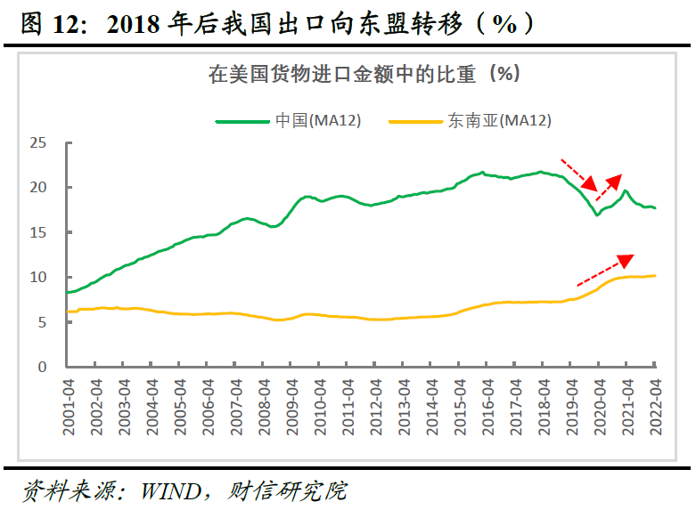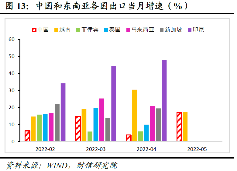 二是短期出口订单存在转移风险,但影响趋于减弱。在东南亚劳动力成本相对低廉的情况下,2018年以来国内出口出现向东盟转移的趋势,疫情爆发后我国产业链优势凸显,贸易转移趋势明显放缓。今年3月份以来,在国内疫情冲击产业链供应链稳定,但越南等东南亚国家放开管制的共同影响下,越南等国家承接了部分国内出口订单,如在美国货物出口金额中,4月中国比重(MA12)较2月下降0.17个百分点,同期东南亚比重(MA12)提高0.05个百分点。预计随着国内疫情形势好转和保供应链产业链政策稳定政策显效,中国全产业链优势将继续显现,国内出口外移趋势大概率趋于减缓,如在国内疫情形势严峻的3、4月份,东南亚占美国进口比重的回升幅度明显低于中国比重的下降幅度(见图12),说明当前东南亚国家不能完全替代中国出口,中国供给优势依然较大。此外,从中国和东南亚国家出口增速的相对变化看,5月份中国和越南出口增速基本相当,越南出口增速持续高于中国的概率不高(见图13)。
