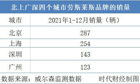 北上广深四个城市劳斯莱斯品牌销量 图源/时代财经制