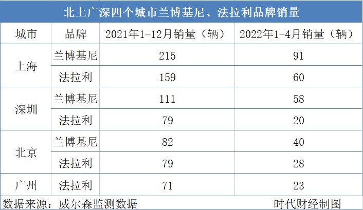 北上广深四个城市兰博基尼、法拉利品牌销量 图源/时代财经制