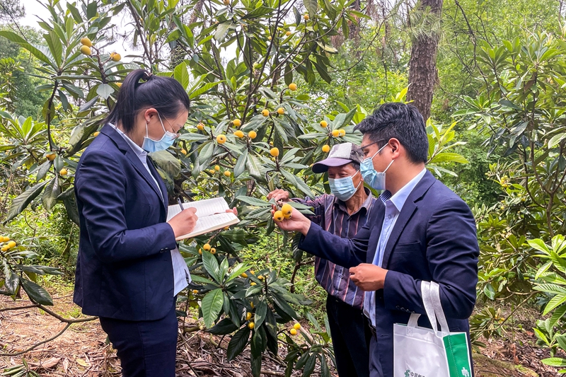 邮储银行浙江金华市分行坚持“普之城乡,惠之于民”理念,围绕共同富裕先行示范区,加大农村金融服务支持力度,助力推进乡村振兴。截至4月末,该行涉农贷款余额282.5亿元,有力地支持了当地“三农”经济发展。图为该行兰溪市支行客户经理在枇杷种植户了解农户金融需求情况。