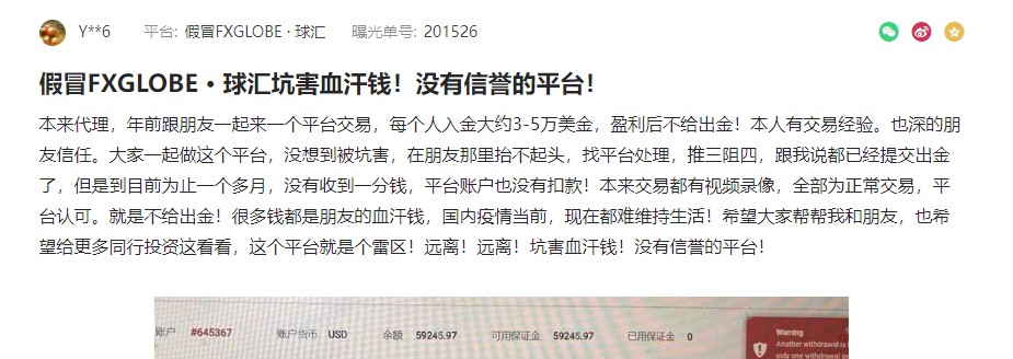 投诉汇友进入的是假冒FX Globe球汇。在假冒FX Globe球汇,汇友本想出金10万元,但平台连续多次都拒绝了他的出金申请。汇友咨询拒绝原因,假冒平台客服告诉他:“出金需要先缴纳税款”。汇友信以为真,按要求缴纳了税款。税款交完之后,账户倒是开始变化了,账户资金由10万变成了0。可是半个月过去了,这10万元还是没有到汇友的提款银行账户中。