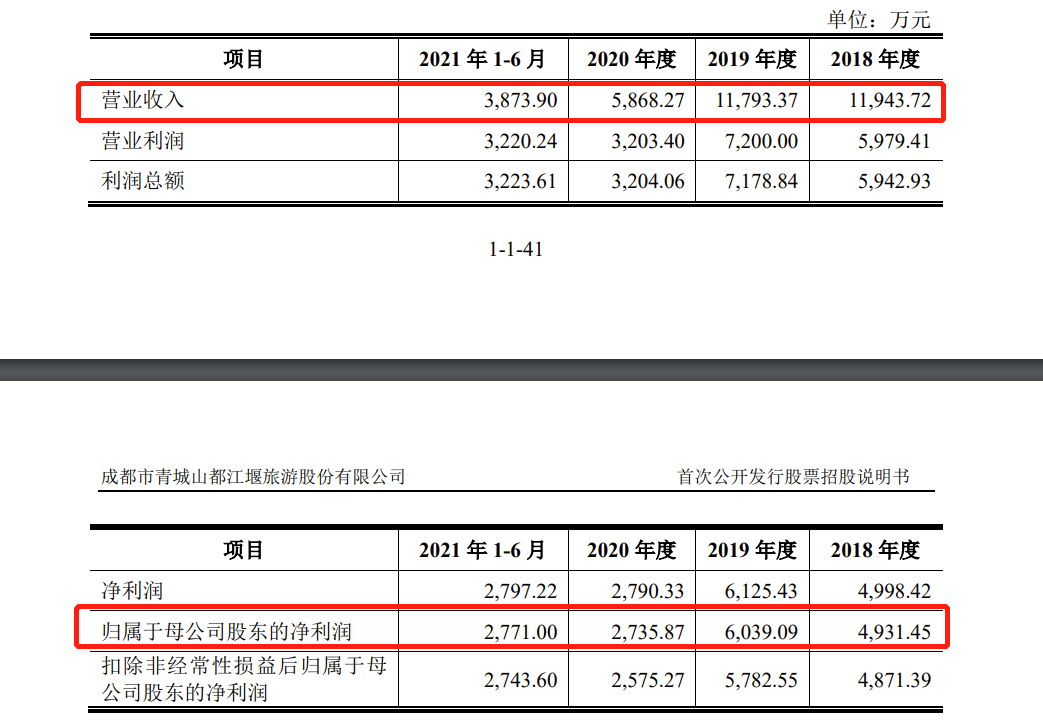 财务数据方面,2020年受疫情影响,青都旅游业绩遭受严重冲击,2018年至2020年,公司营业收入逐年下滑,2020年业绩腰斩,营收仅5868.27万元,同比下滑50.24%;同期归母净利润为2735.87万元,同比下滑54.7%。2021年上半年营收3,873.90万元,归母净利润2771万元。