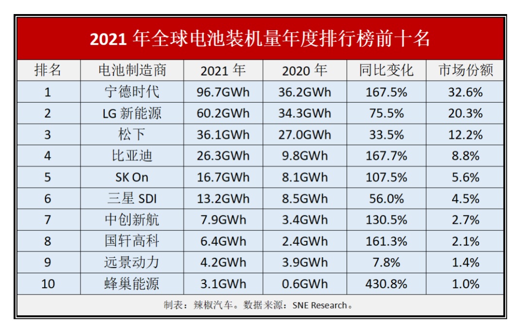 根据韩国市场研究机构SNE Research公布的数据,2021年,全球动力电池前十大巨头中,中国品牌多达六家。