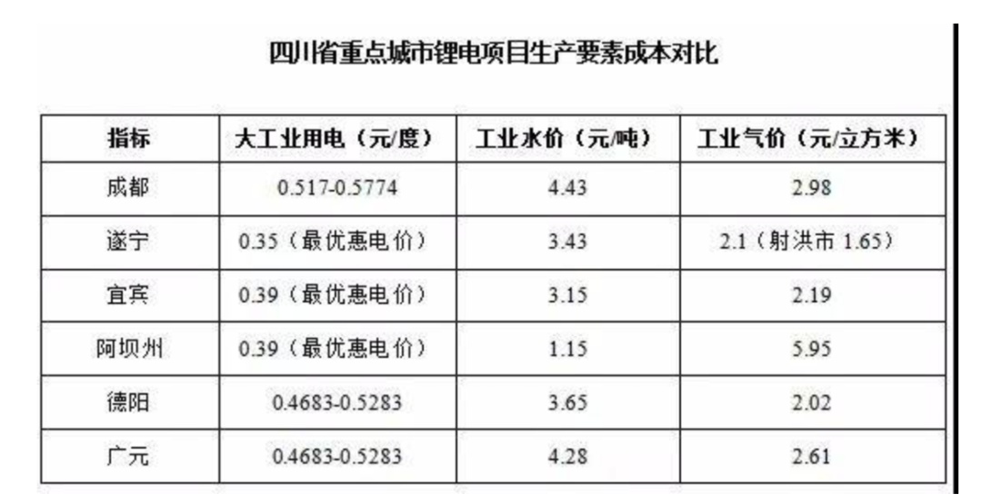 据高工锂电统计,目前四川省重点城市在大工业用电、工业水价、工业起价等方面均给出了相当大的优惠力度。