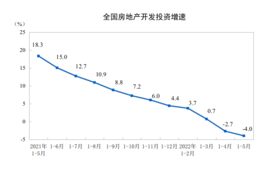 数据显示,1—5月份,全国房地产开发投资52,134亿元,同比下降4.0%;其中,住宅投资39,521亿元,下降3.0%。
