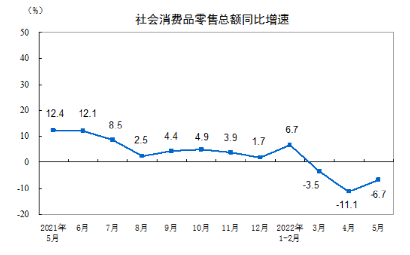 数据显示,5月份,社会消费品零售总额33,547亿元,同比下降6.7%。其中,除汽车以外的消费品零售额30,361亿元,下降5.6%。