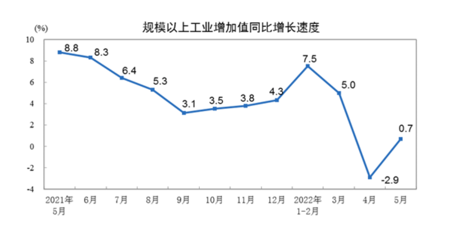 数据显示,5月份,规模以上工业增加值同比实际增长0.7%(以下增加值增速均为扣除价格因素的实际增长率)。从环比看,5月份,规模以上工业增加值比上月增长5.61%。