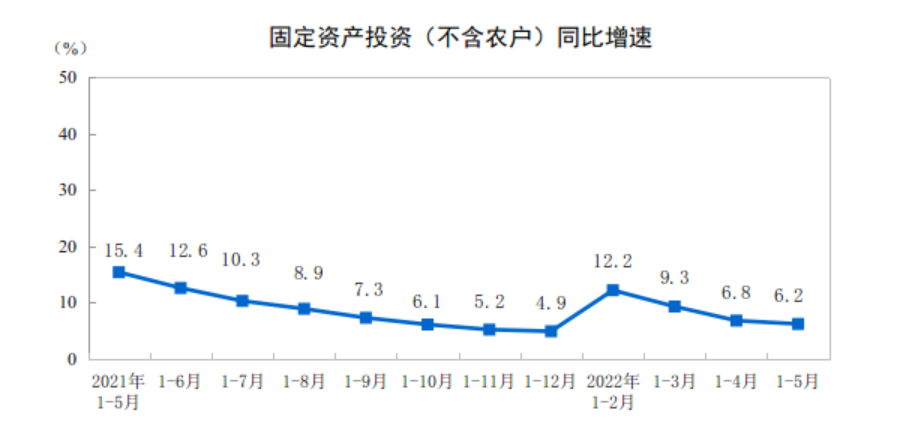 数据显示,1—5月份,全国固定资产投资(不含农户)205,964亿元,同比增长6.2%。其中民间固定资产投资同比增长4.1%。从环比看,5月份固定资产投资(不含农户)增长0.72%。