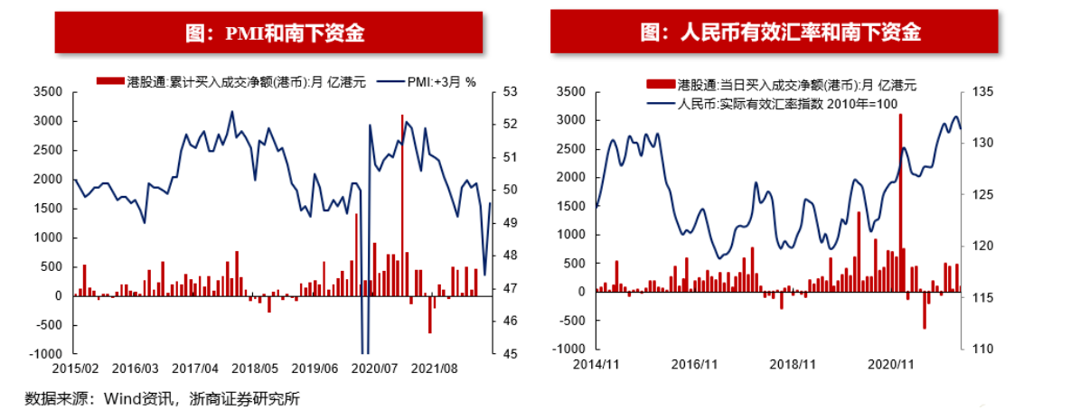 观察人民币有效汇率和南下资金月度净流入规模,可以发现在人民币升值阶段中南下资金持续净流入港股。人民币有效汇率上升,很大程度上受国内经济改善的影响。往往人民币资产在这段时间内受内资和外资共同增持。