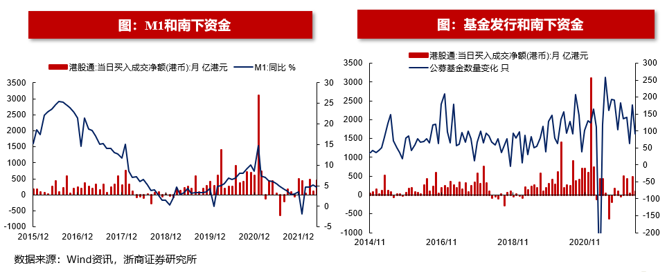 观察公募基金数量变化和南下资金净流入规模之间关系,可以看到两者也呈现较明显的正相关关系。市场流动性较好的时候,公募基金新发行的数量将明显多余清盘数量,此时剩余的流动性也将南下净流入港股市场。