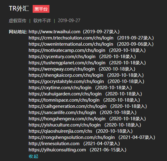 说到频繁更换网址,网上整理了2019年9月以来TR外汇的网址变更历史,仅记录在案的就有20个之多,平均不到两个月就要换一次网址。而小编观察发现,上文提到的两位投诉用户的网址都是https://upayservice.com(资金盘请勿点击),这应该是TR外汇最近新网址,尚未被列入到“曾用网址”名录之中。