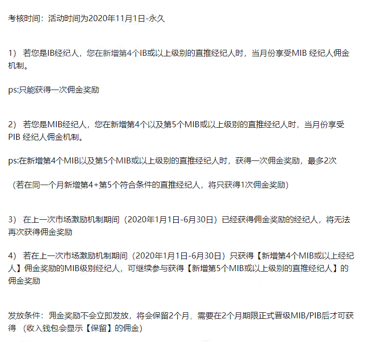 2.若您是MIB经纪人,在新增4个及以上级别的直推经纪人时,当月份享受PIB经纪人佣金机制。