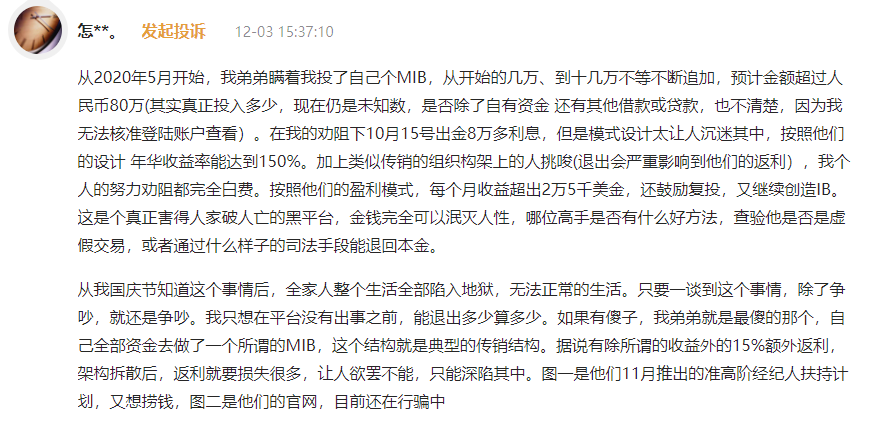 投诉者是TR外汇投资者的姐姐。她称其弟弟自己成了MIB,预计投入了将近80万人民币到该平台。据她透露,按照TR外汇的设计,年化收益率可以达到150%。此外TR外汇采用资金盘模式,不断的拉人头进入架构内,就能额外获得15%的返利。相反,如果退出它们的体系,会严重影响返利。