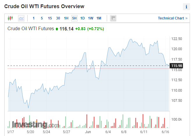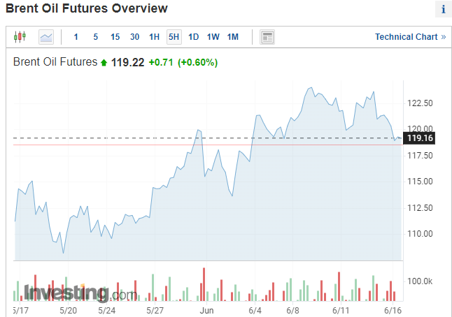 与此同时,石油价格依旧在爬升。6月6日开始,WTI和布伦特原油期货价格再次升上120美元/桶,并在该价格附近震荡。