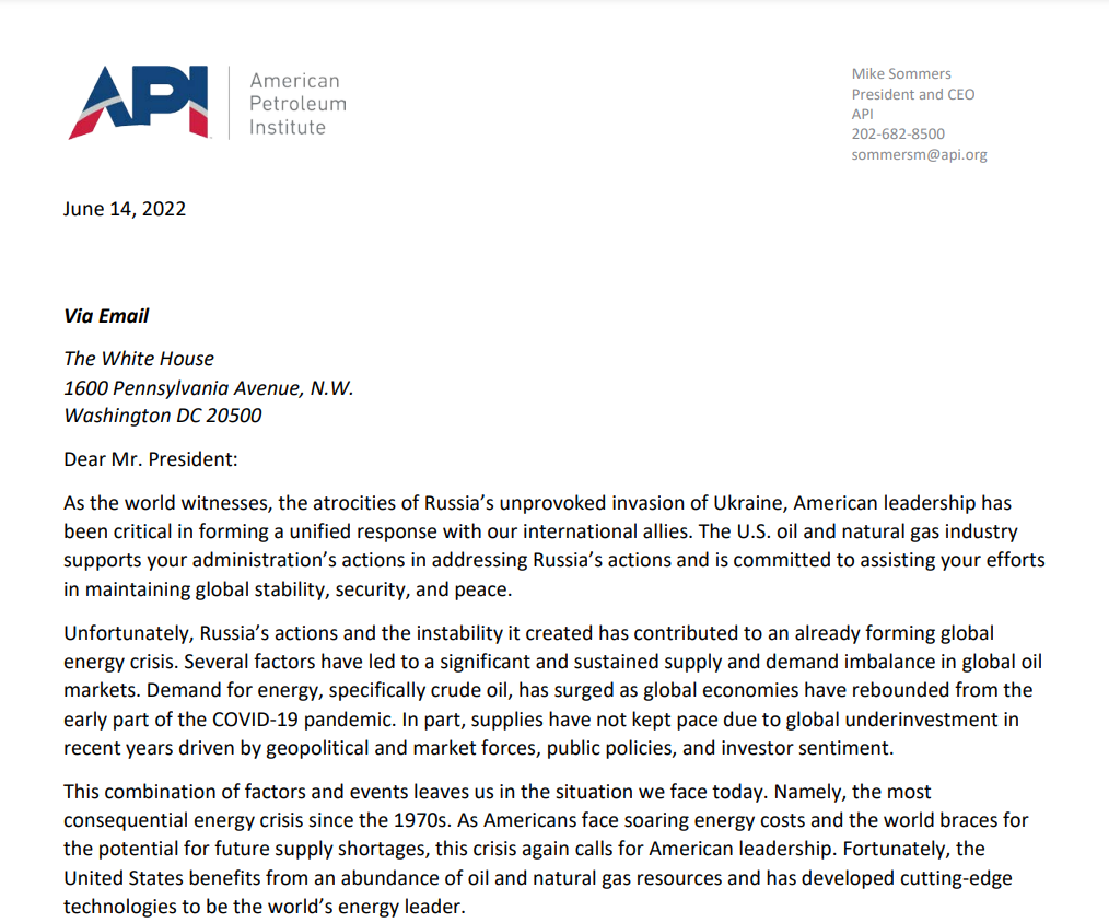 在信的开头,API先是肯定了拜登在对俄制裁上的“努力”,并称其对眼下的能源危机“爱莫能助”: