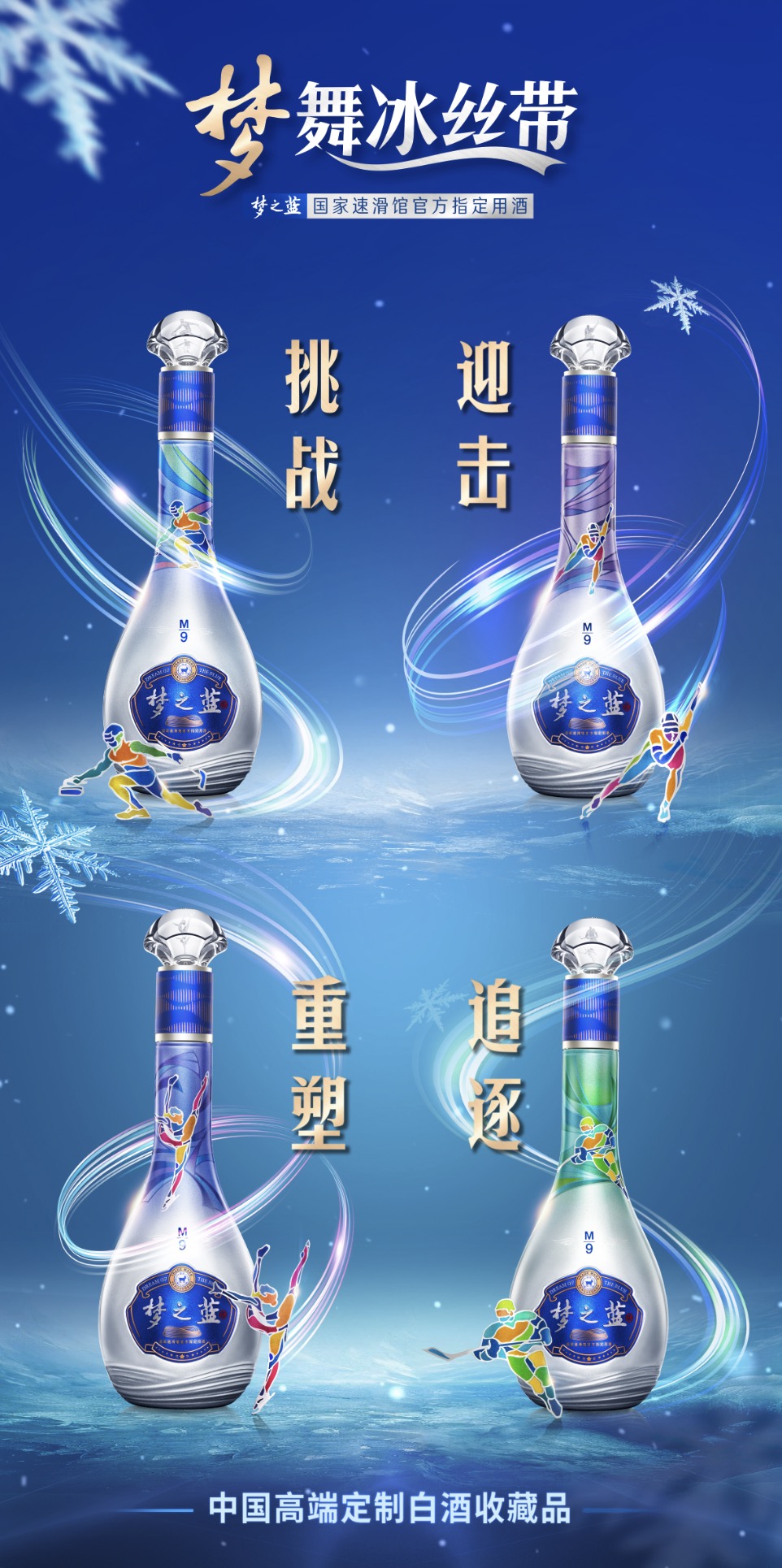 “梦舞冰丝带”定制款限量盲盒中,共有四款梦之蓝M9定制酒,分别聚焦于“优雅速滑”“激情冰球”“魅力冰壶”“唯美花滑”四项运动,结合“速度”“艺术”“力量”等特点,对产品进行主题创意定制。冰雪运动、体育精神、盲盒、联名……种种元素叠加,让该联名酒自带爆款基因,线上线下纷纷掀起了抢购热潮,酒圈的各大微信群里皆是“求购”的消息,众多收藏爱好者称其为“白酒收藏界新的明珠”。