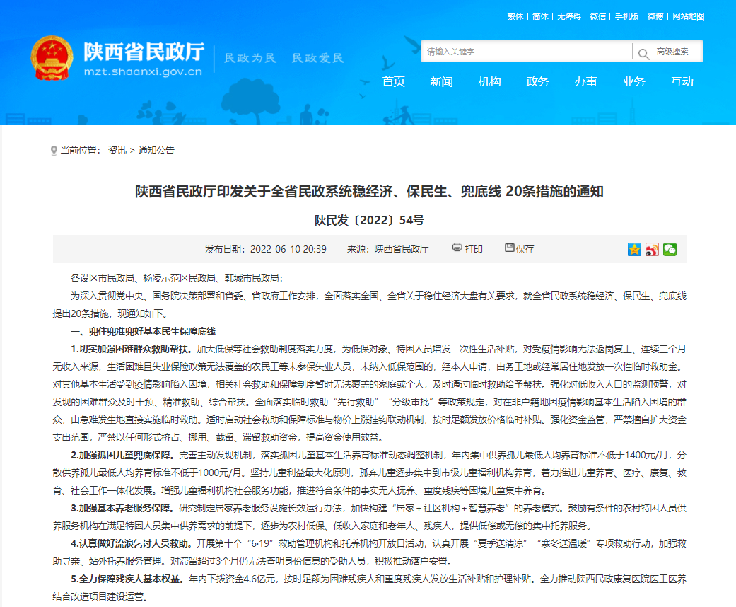 6月10日,陕西省民政厅印发关于全省民政系统稳经济、保民生、兜底线20条措施的通知。该措施主要包括兜住兜准兜好基本民生保障底线、积极开拓就业岗位、加快推进重大项目建设、更好服务市场主体、积极助力乡村振兴、努力促进农民增收、加强福利彩票销售创新管理七大方面。