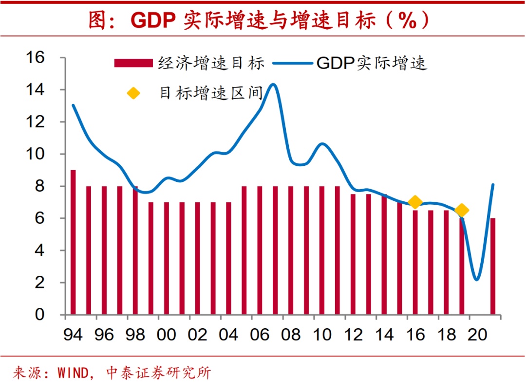 稳增长诉求迫切。政策对于稳增长仍有迫切诉求。每年设定的经济目标具备约束力。从1994年以来的情况看,实际经济增速很少未达标,严格来说,仅有1998年和2014年两年经济增长未达政府工作报告中所提出的目标增速,而差距也均未超过0.2个百分点。即便经济增长目标调整,但幅度可能也不会很大,政策有持续发力的意愿和诉求。