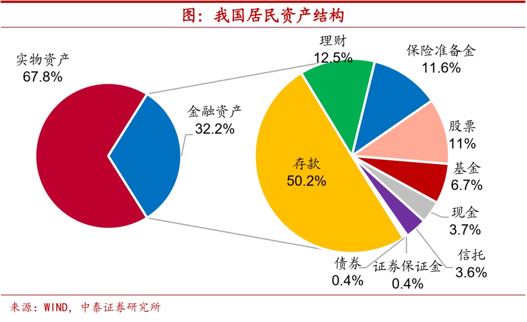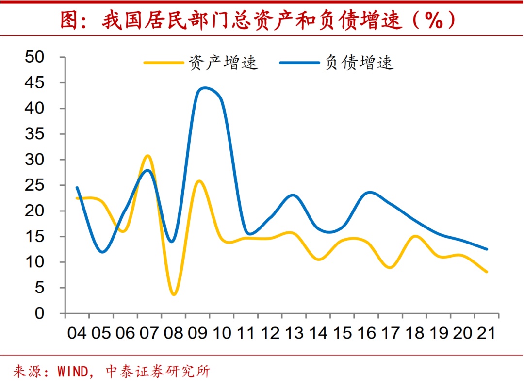资产结构偏重地产。之所以居民存款的高增长和居民财富的提升并不同步,这主要同我国居民资产结构有关。我国居民资产中金融资产占比仅有30%左右,其中以居民存款比重最大,占我国居民总资产的比重约为16%。另外现金中同样有部分归属于居民部门,今年M0增长速度也很快,1季度居民部门的现金较去年底也增长了接近5%,只不过这部分占比相对不高,仅有1%左右。而我国居民资产中的接近70%都是实物资产,其中绝大部分是房地产,我们估计,今年1季度相比于去年年底而言,居民部门持有住房资产规模下滑约4.6个百分点。考虑到居民负债也有1.8%的增长,虽然远低于居民存款的增速,但地产部分价值的下滑也使得居民总(净)资产增速明显走低。