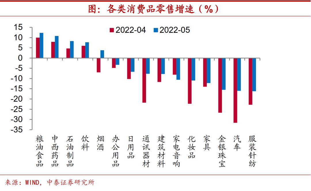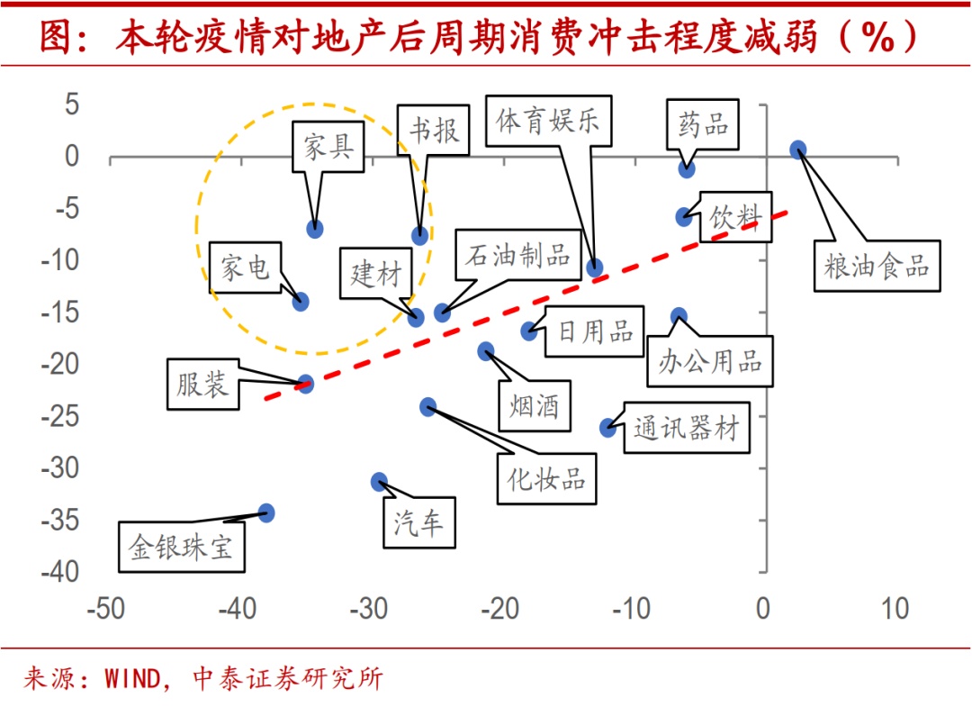 量增重于提价,拉动后周期更甚。在价格有所控制之下,如果地产改善更加地依赖于销量的增长,则这对后周期行业特别是部分可选消费收入的拉动作用,或将比地产行业本身要更为显著。对比本轮疫情和2020年时武汉疫情对于各类消费的影响,我们发现,地产后周期的相关可选消费,在本轮疫情之下,受冲击程度相比于武汉疫情时期已经有所改观。如果在后续政策推动之下,能够迎来地产销售增速的企稳回升,则这些后周期消费行业营收表现或相对占优。据此,我们认为,疫情后消费可能成为权益市场的主线。