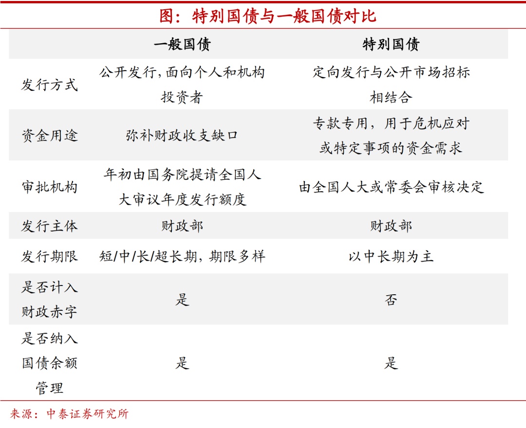 特殊时期财政开源,特别国债四大不同。特别国债有何“特别”之处?一是特别国债由国务院提请全国人大常委会进行审议通过即可,提请审议的时间相对也较弹性,并由财政部负责后续的发行管理;二是特别国债通常在发行审批阶段就已对资金用途做了专门的规定,并有相应的监督管理机制;三是特别国债的发行规模与具体事项所需的资金相契合,限制相对较少;四是特别国债纳入中央财政国债余额管理,在发行时调整国债余额,但其纳入中央政府性基金预算部分,不列入财政赤字。因此,特别国债通常是服务于特定政策、支持特定项目需要而发行的国债,针对性和时效性强于普通国债,常被用于特殊时期财政开源的重要手段。