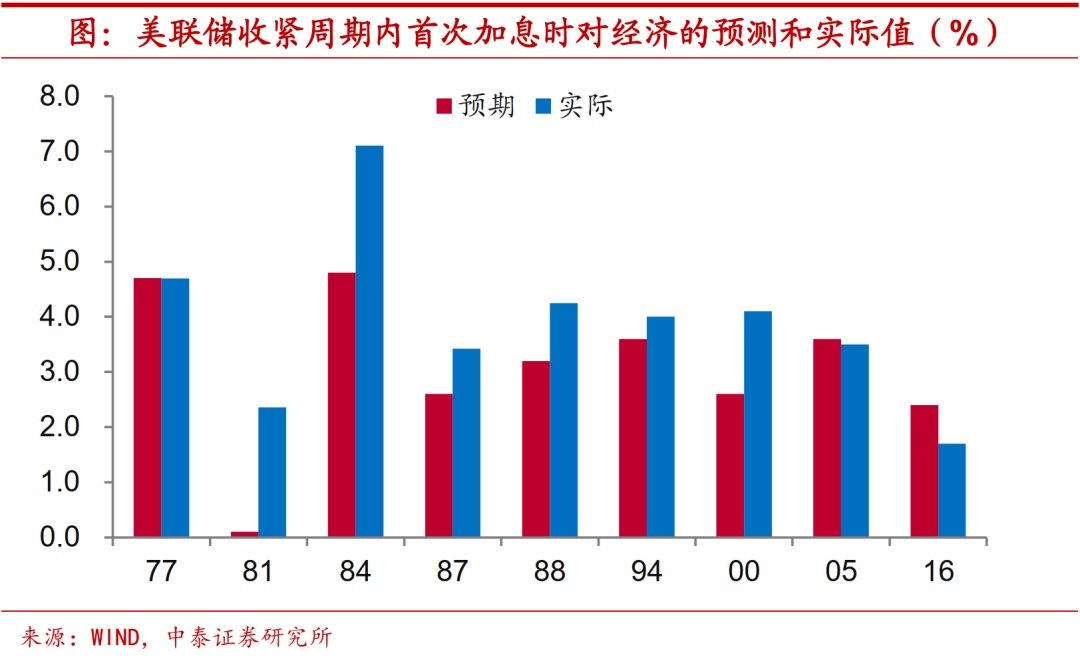 美联储预测是否可信?我们回顾了1975年以来美联储历次加息周期开启时对于下一年经济增长的预期值,并同该年份实际的经济增长情况做以比较。我们发现,多数情况下,实际的经济增速水平要比在加息周期开启时美联储预测的经济增速更高。既然2.8%已经是个不错的增长水平,如果美联储的经济预测不失水准,而又没有“黑天鹅”等意外因素干扰,我们有理由对美国经济增长前景适度乐观,衰退的风险并不算高。