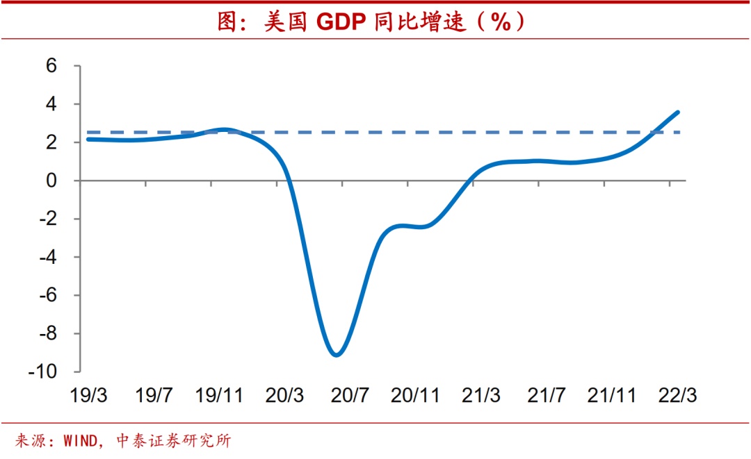 美国仍处恢复进程。去年美国经济增长还没完全恢复,四季度仅有1.6%左右,而1季度虽然环比折年率增速转负,但同比增速仍高达3.6%。货币有所收紧,财政虽然相比于过去两年积极力度回落,但也有保障。