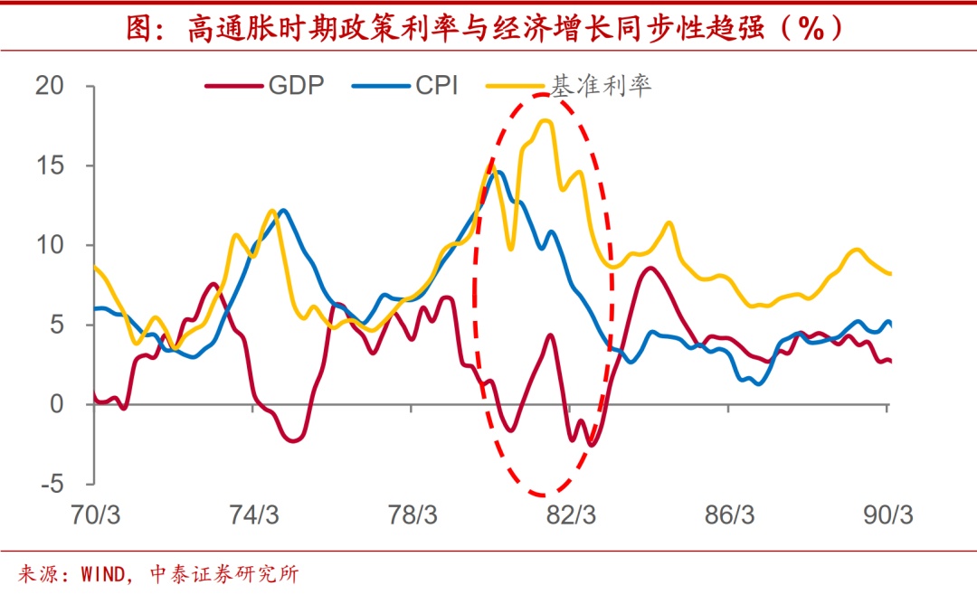加息并非全无帮助。市场普遍担心美联储货币政策收紧会压制美国经济,但其实这是过去很长时间以来低通胀所形成的“刻板印象”。通胀增速高企本身就会抑制需求释放,美联储加息缩表等一系列货币政策收紧动作,虽然对供应链冲击的改善或许有限,但有助于压制通胀预期的进一步上行,一定程度上对需求也存在支撑作用。如美国在20世纪70-80年代大滞胀时期,政策利率和经济增速之间的同步性有所加强。