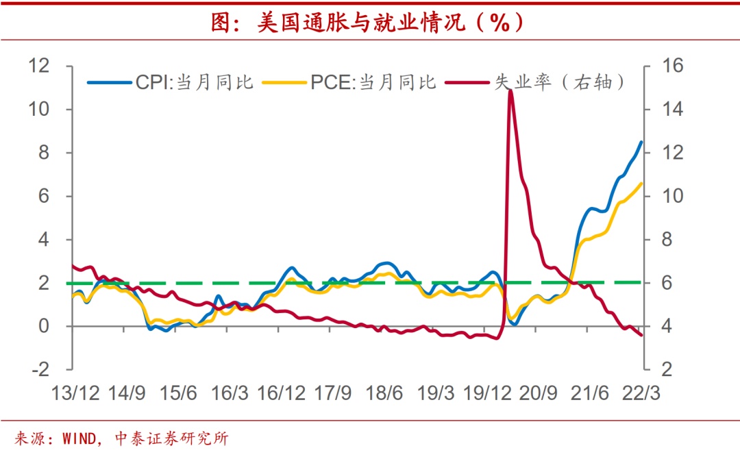 通胀引发货币收紧。从货币政策收紧的成因上来看,本轮加息缩表主要受到通胀的推动。上轮缩表前,美国经济已经步入复苏通道,制造业PMI稳定在荣枯线以上,失业率也创新低,就业市场整体良好,通胀水平一直以来在2%附近波动。而本轮就业市场虽也存在改善,但自2021年年中以来,美国通胀持续高企并逐步攀升,创下自大滞胀时期以来的新高,并且目前尚未出现见顶回落的迹象。