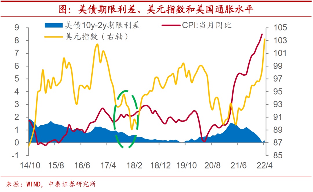 缩表加息紧密配合。从加息和缩表两种货币政策收紧方式的配合性上来看。持续几轮的量化宽松使得美联储资产负债表规模在上一轮缩表前夕,较金融危机发生前扩大近4倍,准备金过度宽裕令美联储试图将总资产规模正常化。同时,由于此前连续加息导致美元指数居高不下,通胀水平低位徘徊,当时在某种意义上,其实是以缩表作为加息的替代手段,这使得收紧方式上更加灵活,相对而言对于汇率和通胀的影响也比加息更为缓和。而反观本轮缩表,其主要目的在于配合加息这一方式,加快抑制通胀上行,缩减资产负债表和准备金规模回收过剩的流动性,特别是推高长端利率进而扩大期限利差,为持续加息创造条件。