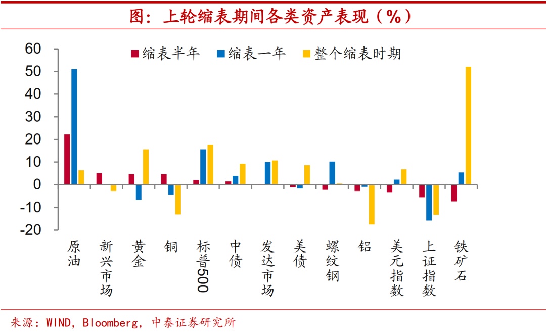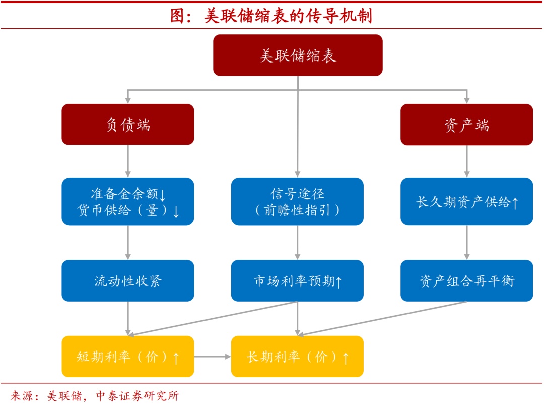 美联储缩表传导路径。美联储资产负债表的扩张是在短期利率无法突破0利率下限约束的情况下,通过继续购买中长期国债,释放流动性并压平收益率曲线,降低长期限利率水平,从而达到继续刺激经济的手段。而缩表本质上是对扩表的逆向操作。一方面,通过降低负债端的准备金规模减少货币供给(量)。另一方面,通过释放政策信号与资产组合再平衡的途径推高利率水平(价)。