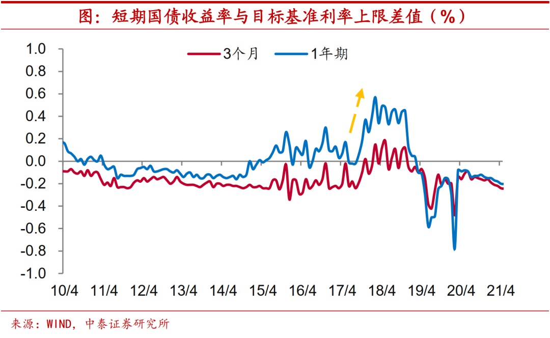 短端利率也会上行。加息主要通过提高资金借贷成本来抑制货币需求,而缩表则直接通过影响货币供给进而推升短端利率。如果剔除加息对短端利率的影响后来看,缩表对短期利率推升事实上也有一定贡献。从上一轮缩表时期来看,短期国债收益率与基准利率目标的差值在美联储缩表前后变化明显,缩表后提高约0.2个百分点。
