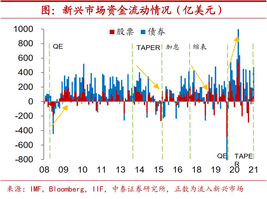 资金流入规模不足上轮一半。在上轮美联储QE期间,新兴市场股债资金净流入约1.3万亿美元,约占美联储资产负债表变动规模近60%。而本轮QE期间,截止2021年底新兴市场股债资金净流入约5700亿美元,不足上轮的一半,且仅占美联储资产负债表变动规模约13%。此外,多数新兴市场经济体已经进行了预防性加息,因而资本进一步外流的规模可能相对有限。