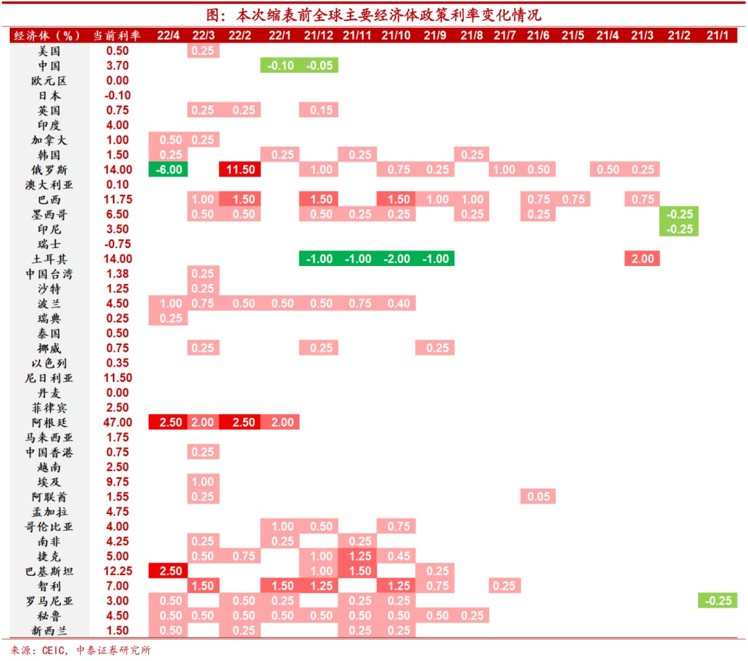 加息抢跑防患未然。从全球货币政策的动向上来看,上轮缩表前,除个别新兴市场加息外,全球主要经济体未见明显收紧。而2021年下半年,随着美联储货币收紧预期上升,俄罗斯、巴西等新兴经济体先后采取预防性加息,防范汇率贬值、资本外流风险。今年以来,俄乌危机推动能源价格高企,为了抑制通胀,全球多数央行都加快了货币收紧进程。多个新兴市场经济体单次加息至少50个基点,新西兰、加拿大、韩国等发达经济体也进入加息队列,全球已经迎来新一轮加息潮。