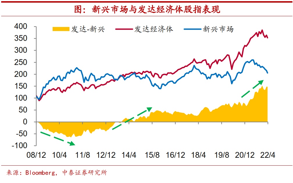 新兴市场风险已有释放。上一轮美联储资产负债表扩张期间,资金大举流向新兴市场,推高了新兴市场的股指表现,直到2013年美联储开始逐步收紧货币政策,全球资金形成回流,发达经济体市场表现较新兴市场更好,而当美联储开始缩表,新兴市场资金进一步流出。不过,本轮QE期间,新兴市场表现事实上不及发达市场。虽然本次货币收紧节奏较快,加息缩表近乎完全重叠,但考虑到新兴市场今年以来资金有所流出,股指已经回调,风险已有一定释放。
