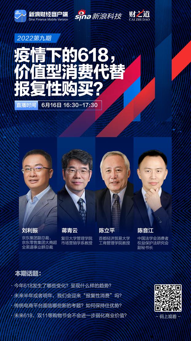 6月16日下午,由新浪财经出品、新浪财经App及新浪科技联合主办的创投沙龙《财之道》2022年第九期,邀请到了京东集团副总裁、京东零售集团大商超全渠道事业群总裁刘利振、复旦大学管理学院市场营销学系教授蒋青云、首都经济贸易大学工商管理学院教授陈立平、中国法学会消费者权益保护法研究会副秘书长陈音江四位嘉宾,围绕“疫情下的618,价值型消费代替报复性购买?”主题进行了深入探讨。
