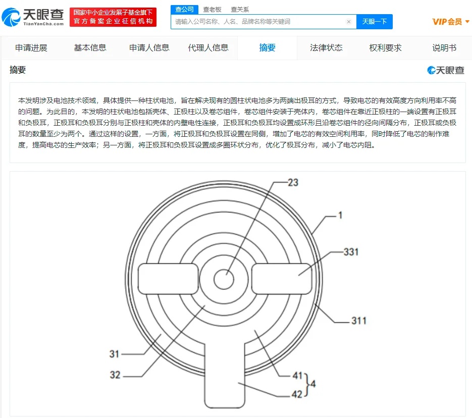 中华网财经6月17日讯,据天眼查显示,近日,蔚来汽车科技(安徽)有限公司“柱状电池”专利公布。据了解,该专利将有望解决因现有的圆柱状电池多为两端出极耳的方式,所导致的电芯有效高度方向利用率不高的问题。