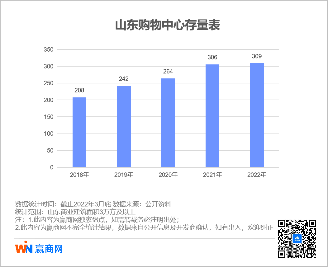 而2018年,山东仅有208个商业项目,五年内增长了101个,平均每年以20个项目的速度在增加。而2022年,山东拟开业购物中心还有超过50个项目亮相。