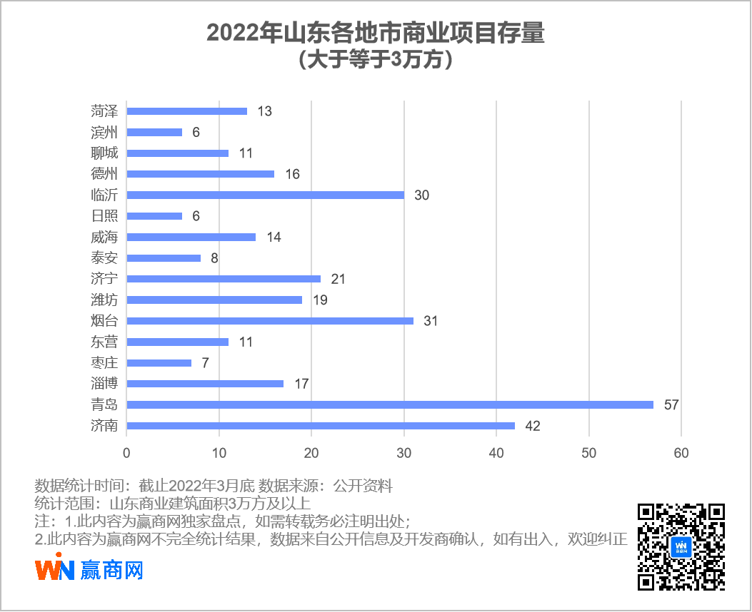 据赢商网统计,截止到2022年一季度,山东商业项目(统计范围:3万㎡以上的购物中心&独立百货)超过309个,商业面积超过2899万方。