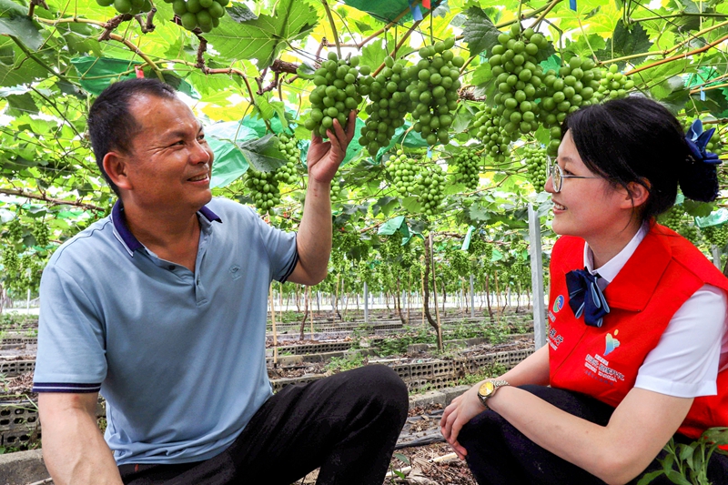 浙江省开化建南家庭农场在开化农商银行的支持下,发展水果种植基地,种植葡萄、无花果等水果。今年又在开化农商银行120万元贷款助力下,使用有机肥精心培育,同时为当地解决就业100余人,目前,葡萄等水果长势喜人,即将进入采摘期。图为该行客户经理在水果基地做贷后管理。